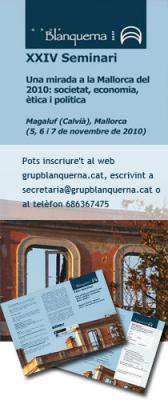 El Grup Blanquerna ha organitzat per als propers dies 5, 6 i 7 de novembre el 24 seminari de tardor sota el títol “Una mirada a la Mallorca del 2010: societat, economia, ètica i política”. El seminari comptarà amb la participació de ponents de Mallorca i dels altres territoris de parla catalana, procedents de diferents àrees i disciplines acadèmiques i professionals. Gemma Calvet, reconeguda advocada catalana experta en ètica i membre del Comitè de Defensa de a Policia de Catalunya; Mireia Mollà, diputada per Compromís pel País Valencià (Bloc Nacionalista Valencià+Iniciativa del Poble Valencià+Verds) a les Corts Valencianes; els periodistes especialitzats en les xarxes de corrupció al País Valencià i a Catalunya, Xavier Aliaga i David Fernandez.