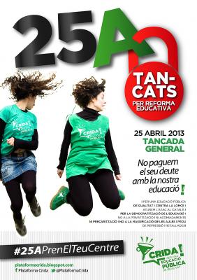 Demà, dia 25 d’abril, la Plataforma en Defensa de l’Escola Pública ha convocat una jornada de tancades als centres educatius amb la voluntat de demanar “una educació capaç de desenvolupar al màxim les seves capacitats de forma harmònica, de formar-los com a persones lliures i crítiques, autònomes en els seus pensaments i accions, capaços de lluitar per una societat autènticament democràtica, socialment avançada i justa que es proposi com a màxim objectiu la felicitat i el benestar dels seus ciutadans” i amb ganes de “seguir lluitant per una educació pública, amb base científica, democràtica, compensadora de les desigualtats, afavoridora d’oportunitats per a tots els joves, eina imprescindible d’una societat autènticament democràtica, justa i socialment avançada.”