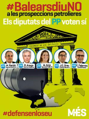 Després que ahir els diputats del PP per les Illes Balears al Congrés rebutjassin una iniciativa parlamentària contra les prospeccions petrolíferes i que el Govern espanyol aprovàs l’informe d’impacte ambiental favorable a les prospeccions a les Illes Canàries, el Grup Parlamentari MÉS ha instat el president Bauzá a exigir l’acta dels diputats del seu partit a Madrid i a articular un front comú social i polític contra els sondejos a les Illes Balears.