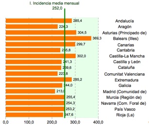 “Sí, som la locomotora d'Espanya”, ha afirmat el diputat, “però en accidents laborals, ja que segons les darreres dades disponibles del Ministeri de Treball i SS, Balears es surt de la gràfica, i tenim un 50% més d'accidents mensuals que la mitjana espanyola” (veure gràfica). A més, de 2013 a 2014, els accidents varen passar de 13.253 a 14.677, amb un increment del 11% en uns accidents “que amb uns mínims mitjans de prevenció i seguretat se podrien haver evitat”.