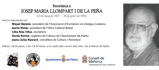 Aquest dilluns 28 de gener fa 15 anys de la mort d'aquest poeta, editor, crÃtic literari, intel•lectual i activista cultural. El Consell de Mallorca, l'Ajuntament de Palma, l'OCB i l'AELC han celebrat l'acte "Recordança a Josep Maria Llompart"
