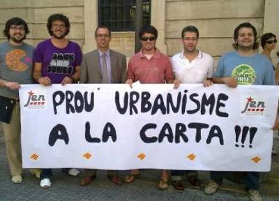 Mentrestant, a l’exterior del Parlament, membres dels Joves d’Esquerra Nacionalista (JEN-PSM) s’han manifestat sota el lema “Prou d’urbanisme a la carta!”. A la concentració dels joves nacionalistes s’ha afegit el secretari general del PSM-EN i portaveu parlamentari del BLOC, Biel Barceló, que ha sortit un moment de l’hemicicle per donar-los suport. Tant els JEN-PSM com el líder nacionalista han qualificat l’aprovació de la llei promoguda per PP i UM com “un exercici d’urbanisme a la carta indigne de la cambra legislativa del nostre país”.