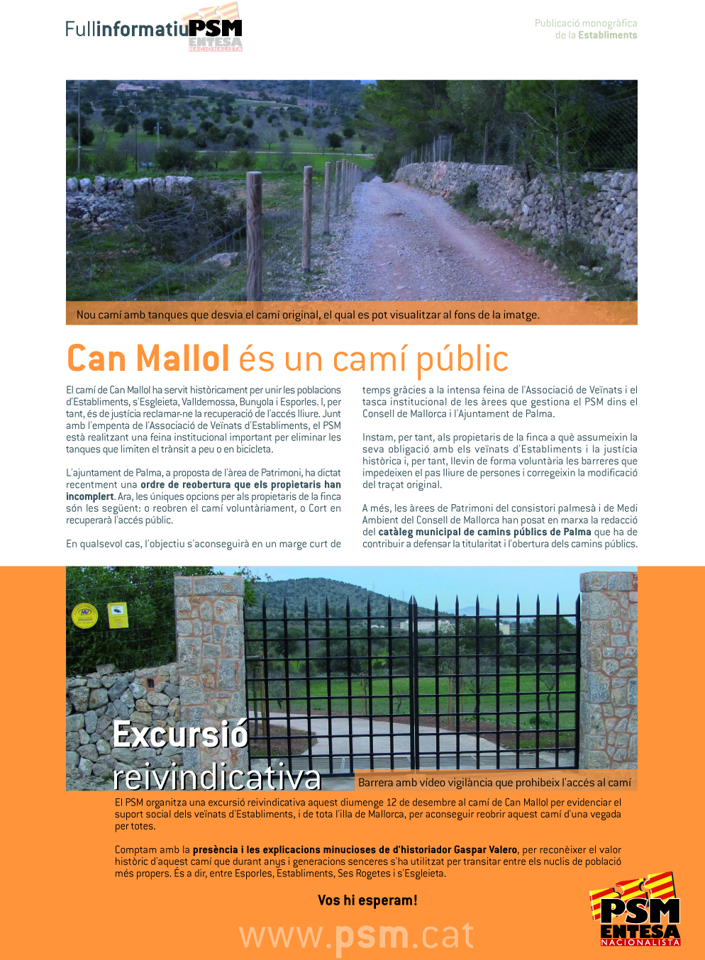 També s'hi explica el risc amb el que conviuen els veïnats del poble per culpa de la inseguretat de la carretera i per tant el PSM se suma a la reivindicació de voreres per tot el tram que va de la creu fins passada l'entrada del camí de Can Mallol.