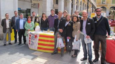 Biel Barceló, Fina Santiago, Joan Font, Magdalena Palou, Antoni Verger, Marisol Fernández, Antoni Alorda i Antoni Noguera, entre d’altres, han visitat les diferents paradetes. Els Joves d’Esquerra Nacionalista (JEN-PSM) han repartit llaços amb la senyera en el marc de la campanya “Enllaçats pel català”. A la imatge, els representants de la coalició PSM-IV-ExM amb els joves, a la Plaça Major de Palma.