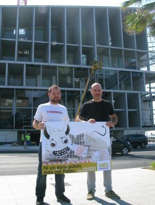 El portaveu de MÉS a Cort i el diputat David Abril han comparegut davant el “monstre del Palau” per denunciar que els 126 milions d’euros (el cost inicial pressupostat eren 110 milions) que haurà costat aquesta infraestructura ruïnosa no podran dedicar-se a Serveis Socials, Salut, Educació, i altres serveis públics retallats